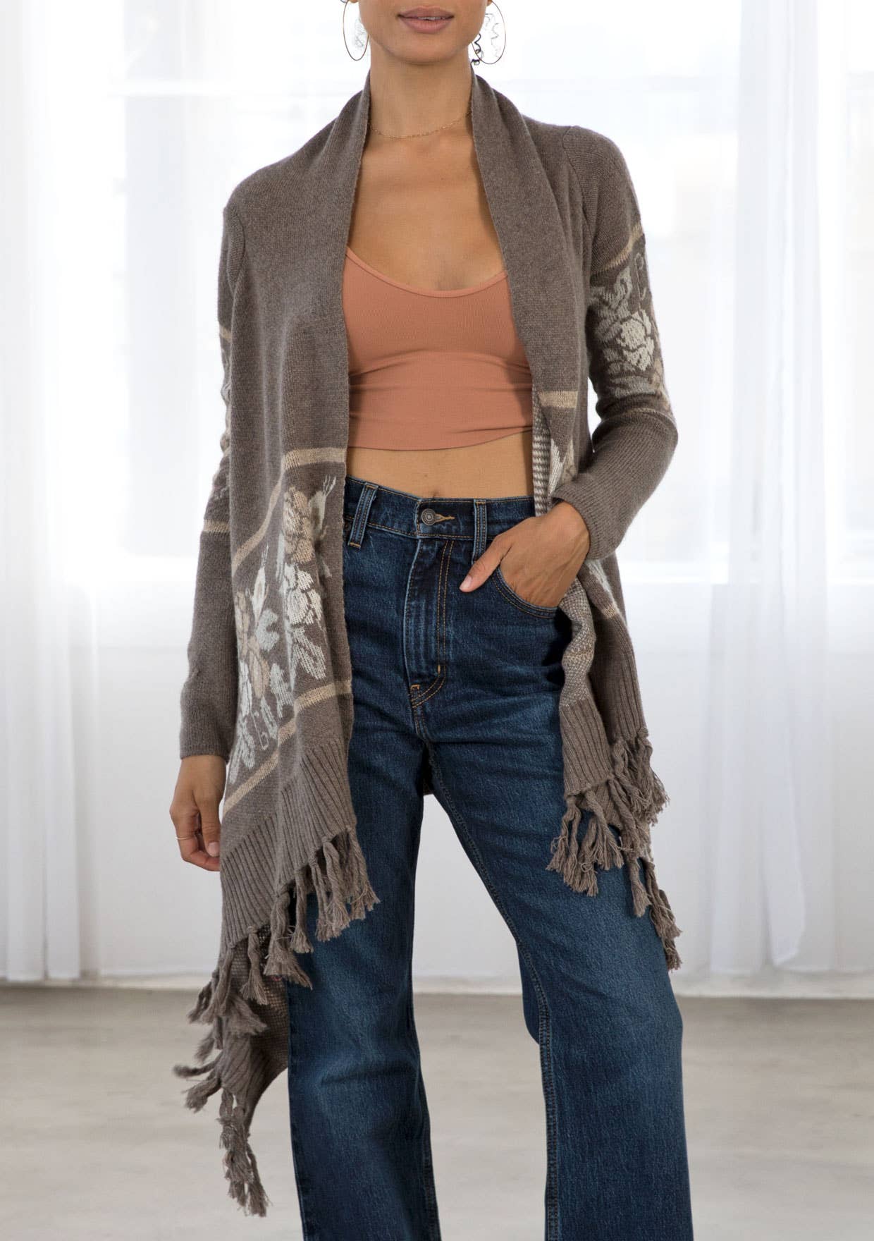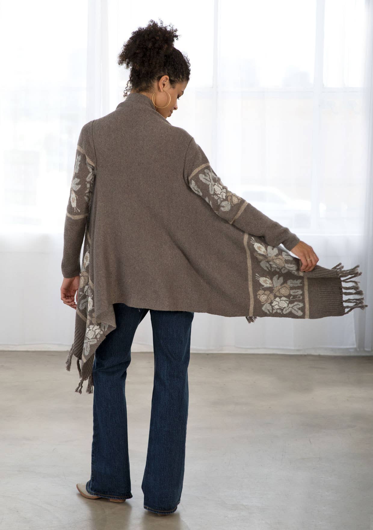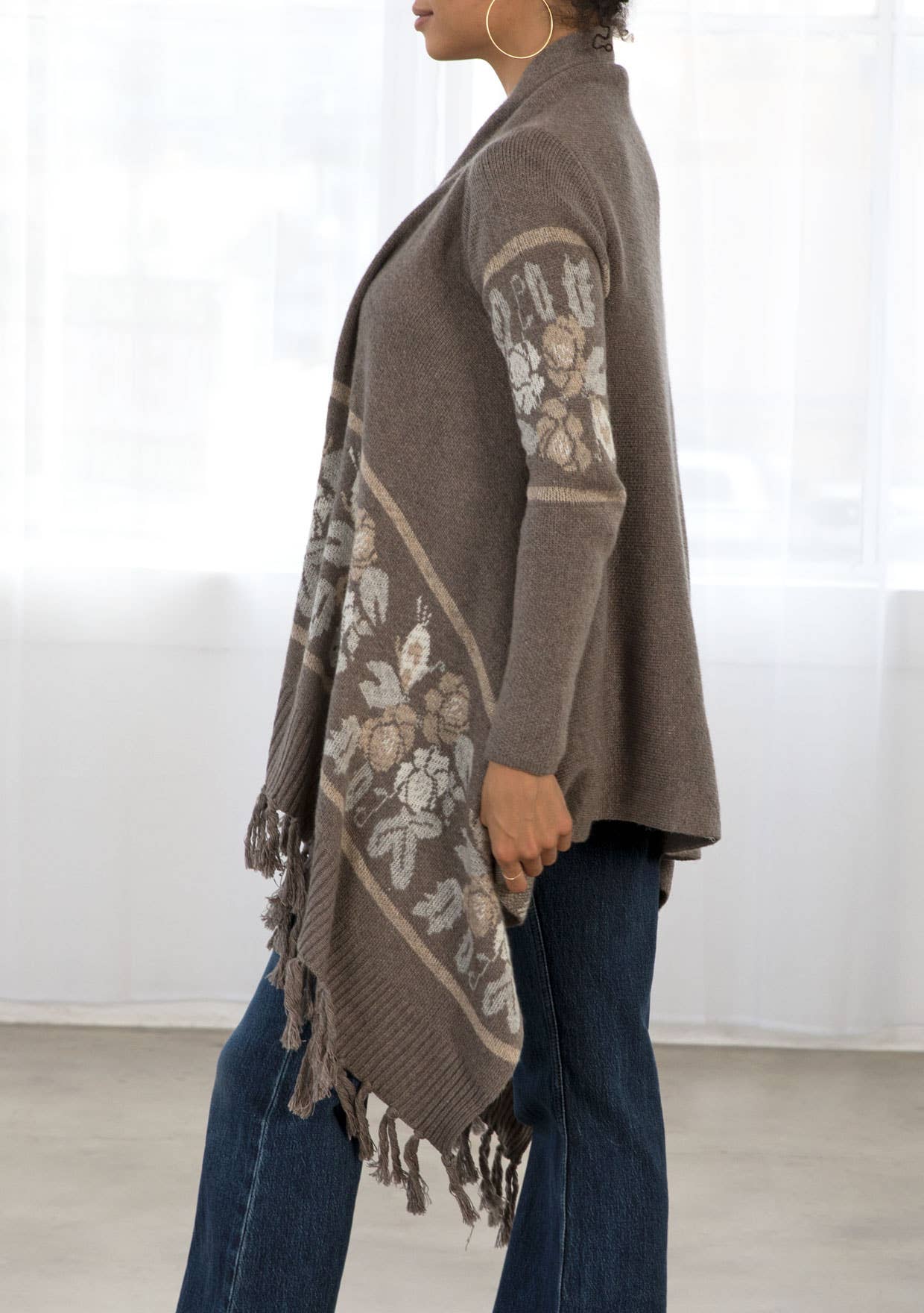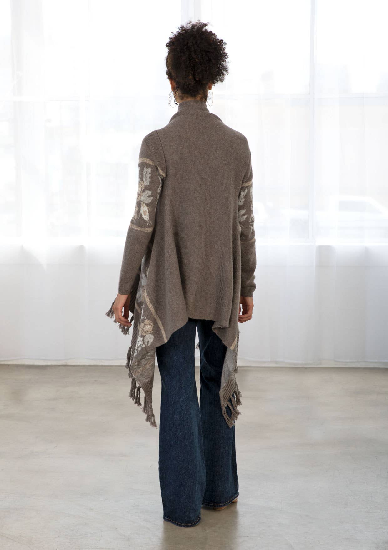 This long sleeve knit sweater has an open front with western floral trim and fringe accent hem. Features long cozy sleeves, a shawl collar, ribbed detail, and a pretty waterfall hem.