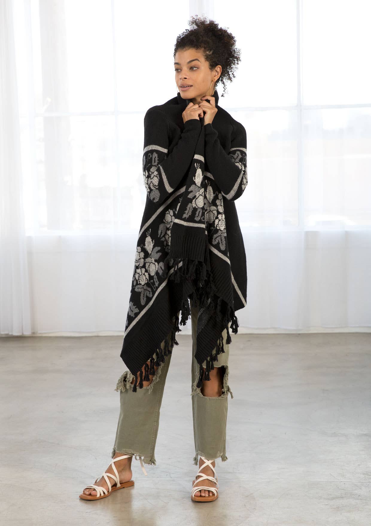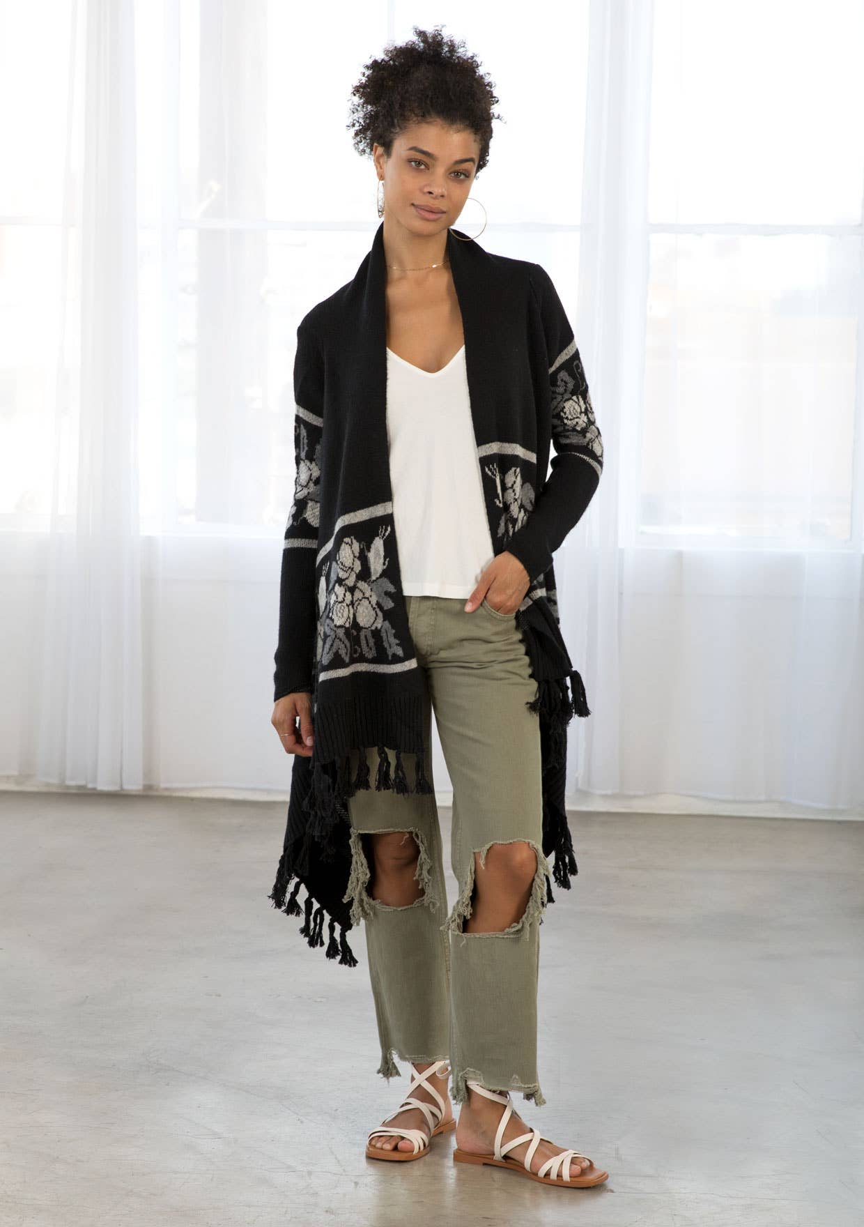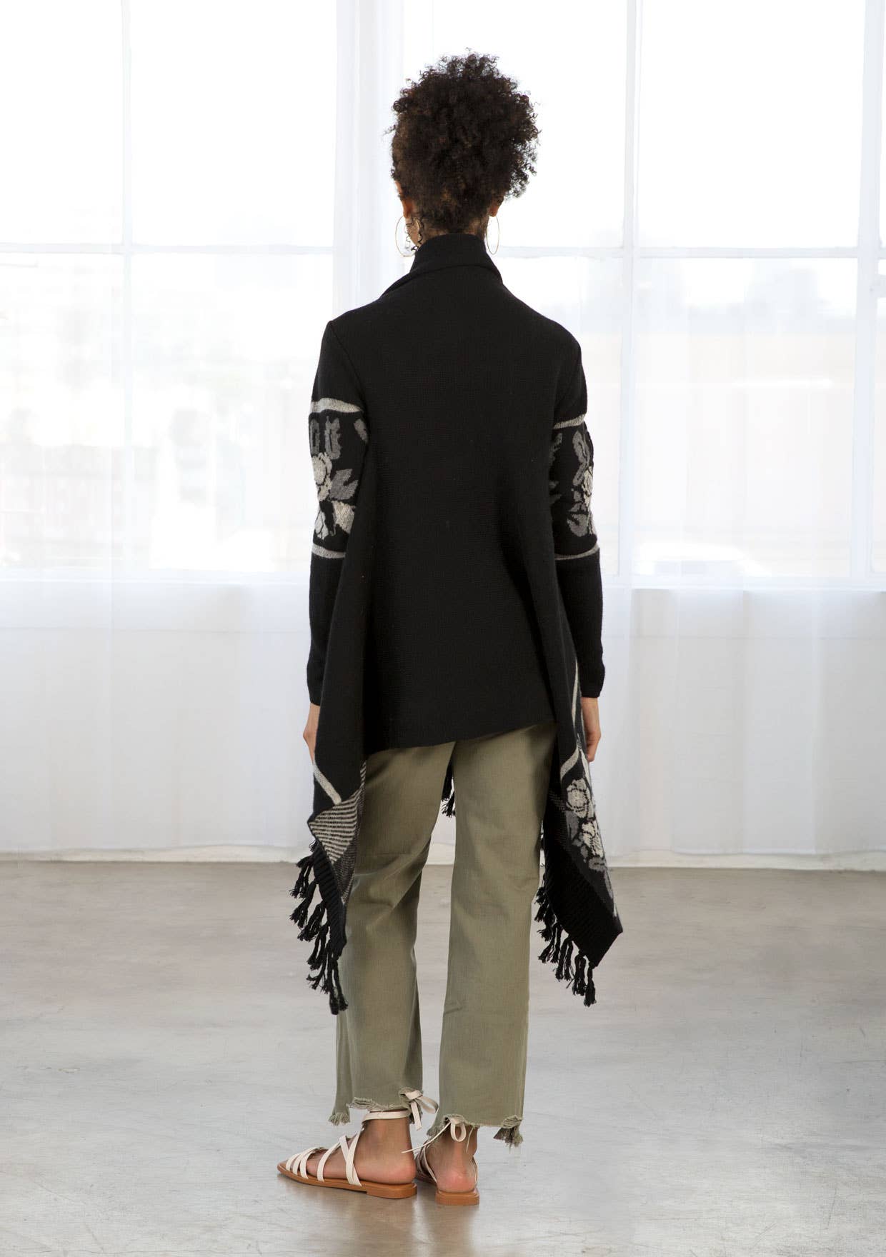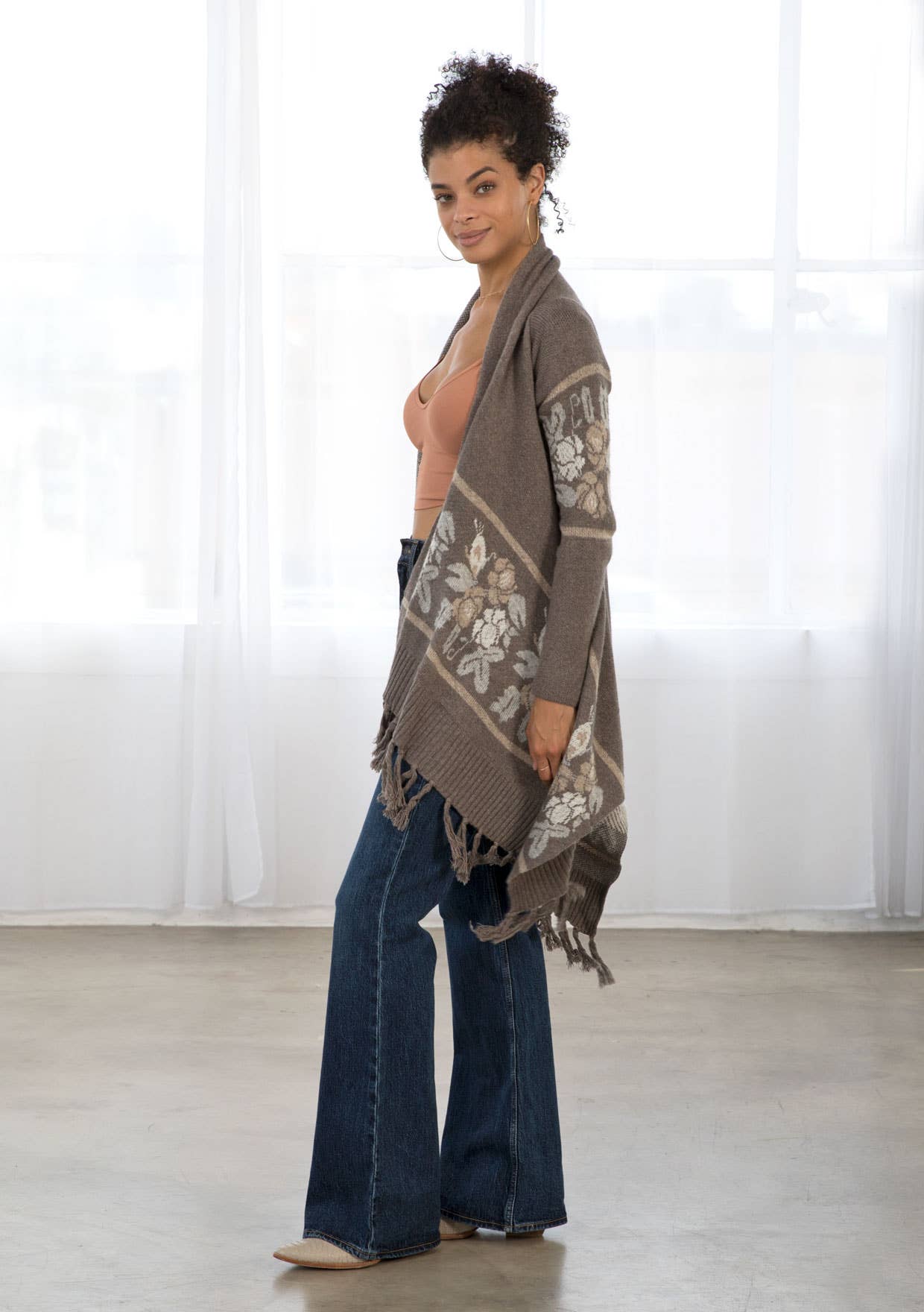 This long sleeve knit sweater has an open front with western floral trim and fringe accent hem. Features long cozy sleeves, a shawl collar, ribbed detail, and a pretty waterfall hem.